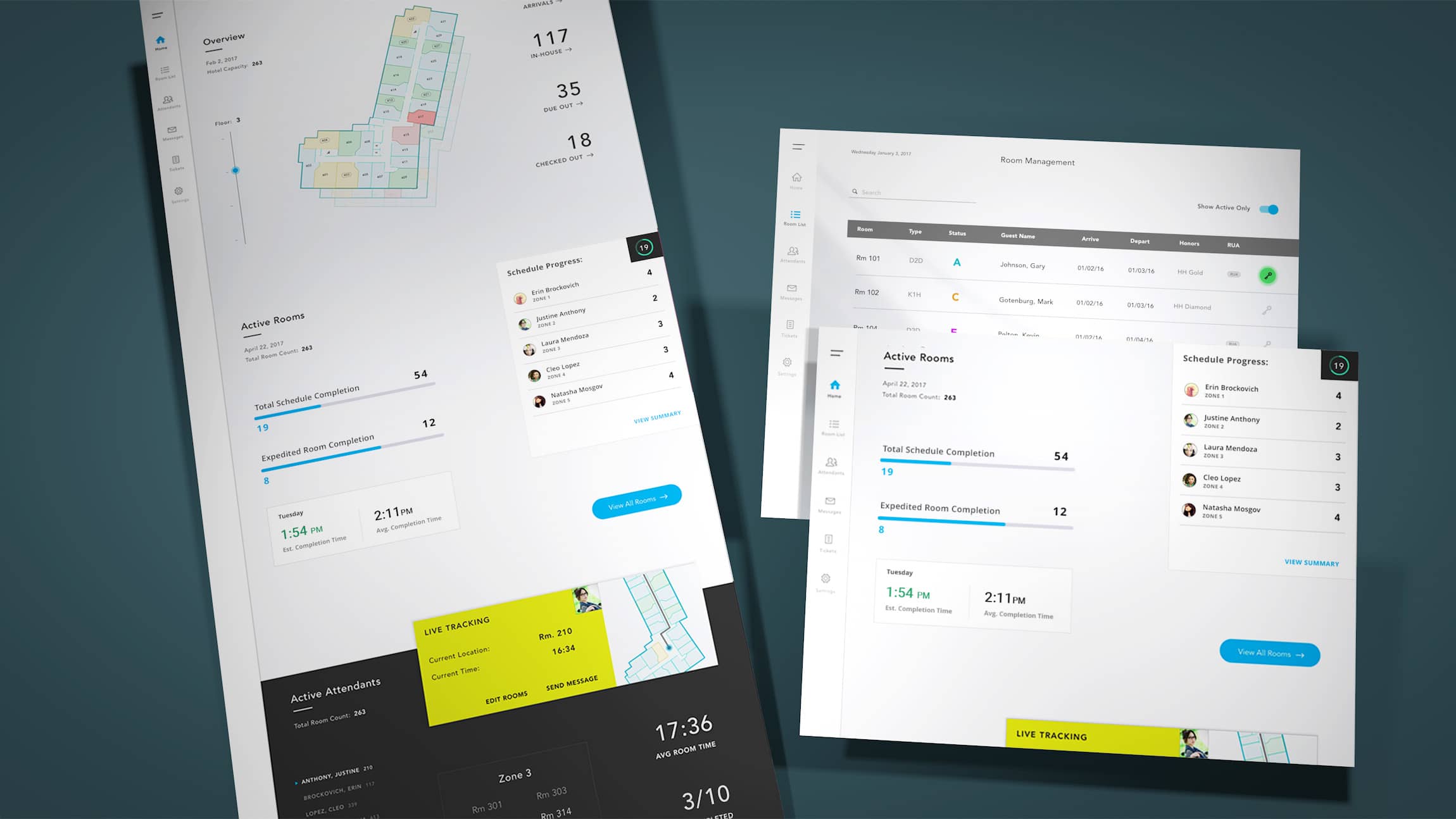 The home screen hierarchy includes informative insights for general hotel status, scheduled room completion, active attendants, and lost and found to quickly see and act as needed.