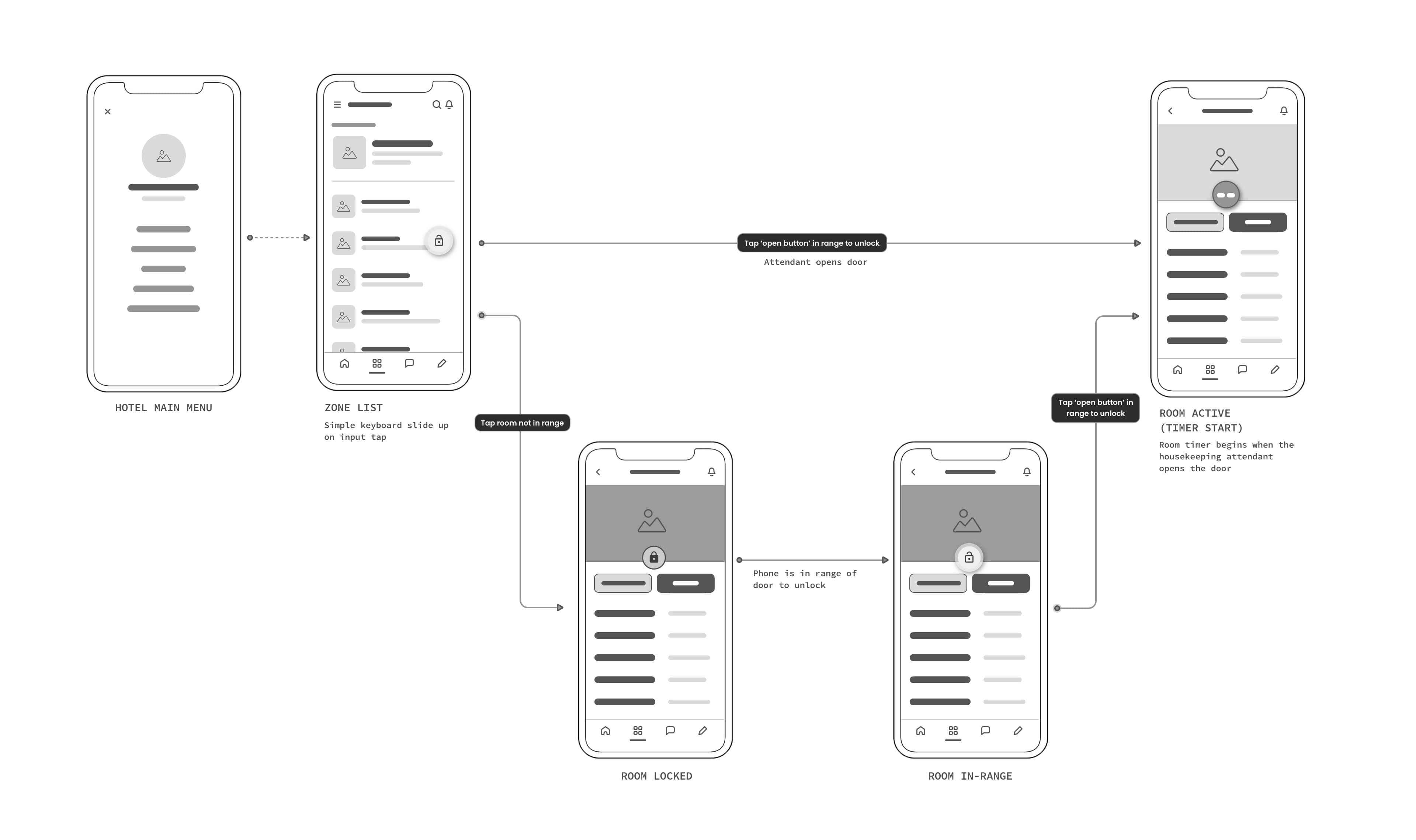 While developing the wireframes, I thought of a feature that could solve the digital key business requirement, as well as some user pain points. By pairing the door unlock feature with a timer, the housekeeping attendants have immediate insights into how long they have spent cleaning any given room. Based on the size of the room and level of cleaning required, they are able to see how much time is usually spent cleaning any given room. Housekeeping managers can also reference this metric in a number of ways to get better insights into day-to-day operations.